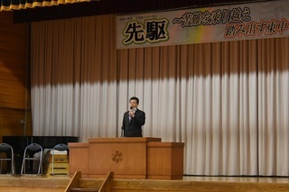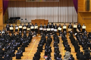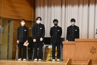 12月24日(金)に終業式が行われました。各学年と総務代表の生徒から、2学期の振り返りや3学期の抱負がしっかりと述べられました。また、表彰も行われ多数の賞状が紹介されました。美術部の生徒の作品が、県内にポスターとして貼り出されたり、カレンダーに使用されたりするそうです。2学期も無事に終えることができたのも、保護者、地域の方々のご協力のおかげです。ありがとうございました。3学期もよろしくお願いいたします。