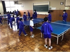 部活動体験で約15人、体験していました。左の写真は三年生が一年生に活動のやり方を教えている様子です。主な練習内容は、フォア、バック、ツッツキです。練習の最後は、試合をするそうです。