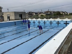 この日は、活動に使うプールを掃除していました。顧問の先生は、部員に「自分で考えて練習しよう」と、指導しているそうです。直江津東中学校は数少ない50Mプールがあります。また、昨年度はコースロープを新しくしました。そんな素晴らしい環境で練習している水泳部は、「それぞれが自己ベスト更新」を目標に頑張っています。