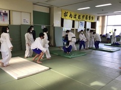 次に紹介する部活は、柔道部です。取材をした時は、一年生が受け身の練習をしていました。部員たちには「毎日、目標を持って練習させている」と顧問の先生がおっしゃっていました。休憩時間には「柔道だけでなく、お笑いも頑張る」という言葉通り、笑顔が見られ、部員同士の仲の良さが見えました。今年度は「地区大会優勝」を目標に日々練習に励んでいます。